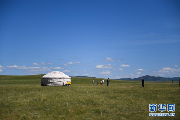 游客在克什克騰旗貢格爾草原上游玩(8月11日攝)。 克什克騰旗位于內蒙古自治區赤峰市西北部,境內的湖泊、河流、草原、森林等自然景觀,讓人們流連忘返。 新華社記者 劉磊 攝