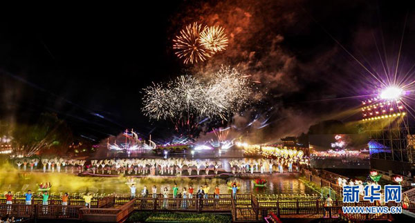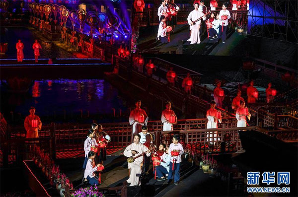 9月28日,演員在開燈儀式上表演歌舞節目。 當日,2020海峽兩岸(昆山)中秋燈會在江蘇昆山開幕,為期一個月。燈會設置的水鄉周莊燈區以水鄉、古鎮、田園江南為依托,將傳統彩燈與現代光影藝術相融合,打造“水韻芳華”夜周莊。 新華社記者 楊磊 攝