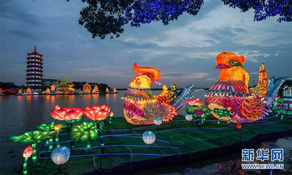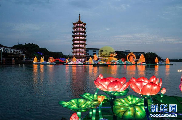 9月28日拍攝的“情意綿綿”燈組(前右)與“月滿周莊”燈組(后左)。 當日,2020海峽兩岸(昆山)中秋燈會在江蘇昆山開幕,為期一個月。燈會設置的水鄉周莊燈區以水鄉、古鎮、田園江南為依托,將傳統彩燈與現代光影藝術相融合,打造“水韻芳華”夜周莊。 新華社記者 楊磊 攝