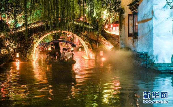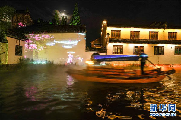 9月28日,一艘游船劃過燈光璀璨的水巷。 當日,2020海峽兩岸(昆山)中秋燈會在江蘇昆山開幕,為期一個月。燈會設置的水鄉周莊燈區以水鄉、古鎮、田園江南為依托,將傳統彩燈與現代光影藝術相融合,打造“水韻芳華”夜周莊。 新華社記者 楊磊 攝