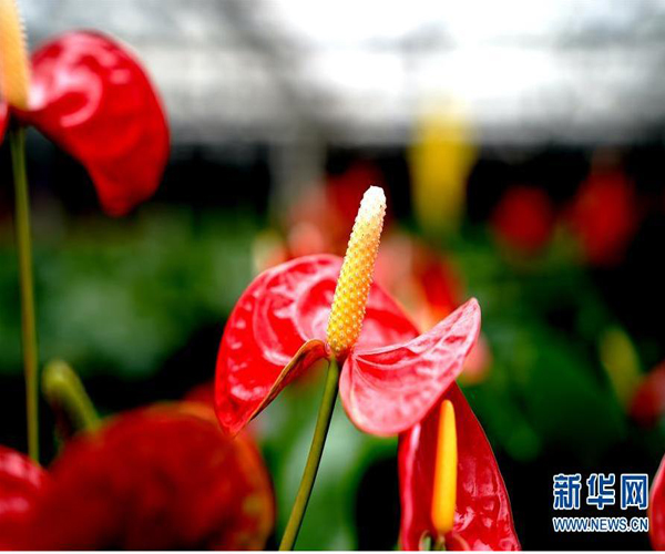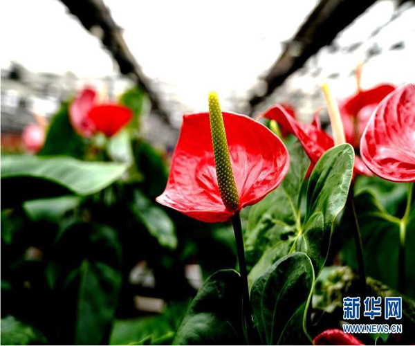 1月21日,在上海鮮花港拍攝的紅掌新品種“紅裝”。 近日,上海鮮花港自主研發的兩個紅掌新品種“紅胭”“紅裝”獲得國家植物新品種授權。目前,上海鮮花港已建成紅掌品種資源圃,收集保存紅掌品種達100多個。 新華社記者 張建松 攝