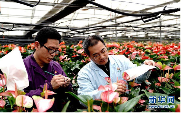1月21日,上海鮮花港技術總監王暉(右)給人工授粉的紅掌進行隔離保護。 近日,上海鮮花港自主研發的兩個紅掌新品種“紅胭”“紅裝”獲得國家植物新品種授權。目前,上海鮮花港已建成紅掌品種資源圃,收集保存紅掌品種達100多個。 新華社記者 張建松 攝