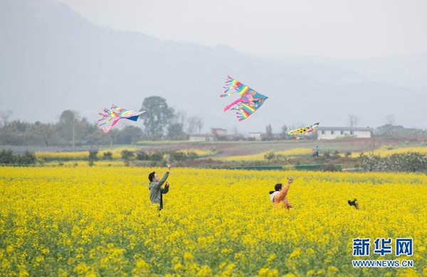 2月27日,游客在成都市金堂縣三溪鎮(zhèn)長(zhǎng)林村油菜花田里放風(fēng)箏。