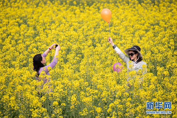 2月27日,兩名游客在成都市金堂縣三溪鎮(zhèn)長(zhǎng)林村油菜花田里拍照。