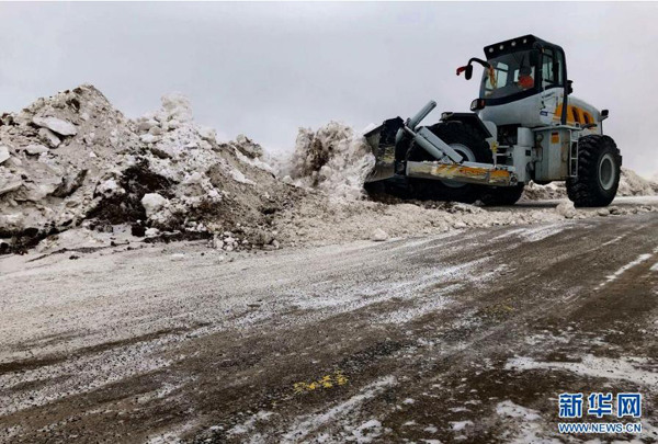 在國道109線K3378路段,安多公路養(yǎng)護段投入大型機械清除冰雪(2019年2月16日攝)。新華社發(fā)(邊巴央吉 攝)