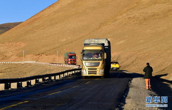 安多公路養(yǎng)護段巡護車和一輛貨車行進在國道109唐古拉山口路段(1月13日攝)。新華社記者 張汝鋒 攝