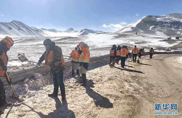 在國道109線K3349路段,安多公路養(yǎng)護段工作人員進行除雪除冰作業(yè)(2019年2月13日攝)。新華社發(fā)(邊巴央吉 攝)