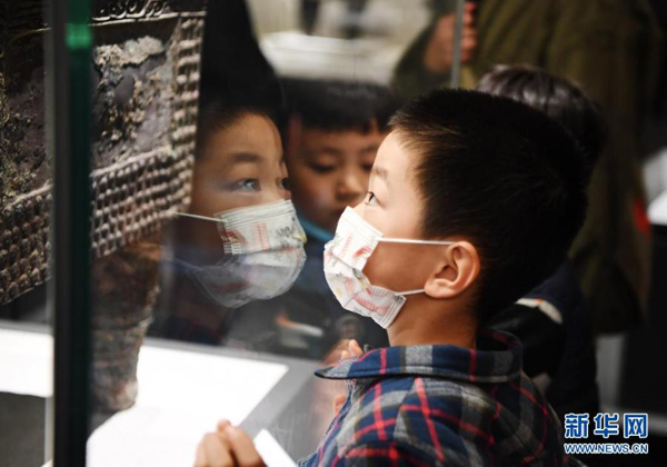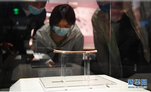4月5日,參觀者在觀看河南博物院展出的骨笛