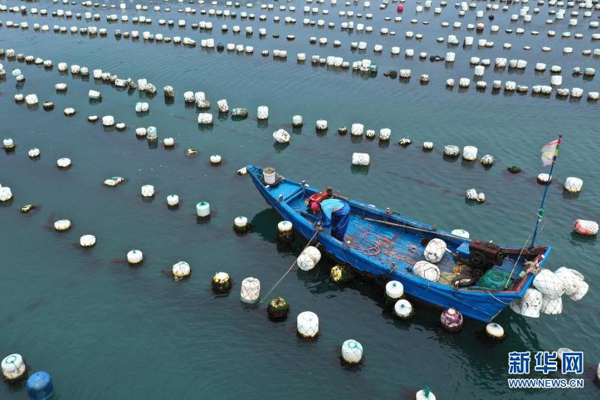5月29日,浙江省舟山市嵊泗縣枸杞島的漁民駕著小船在貽貝養殖基地培育貽貝(無人機照片)。