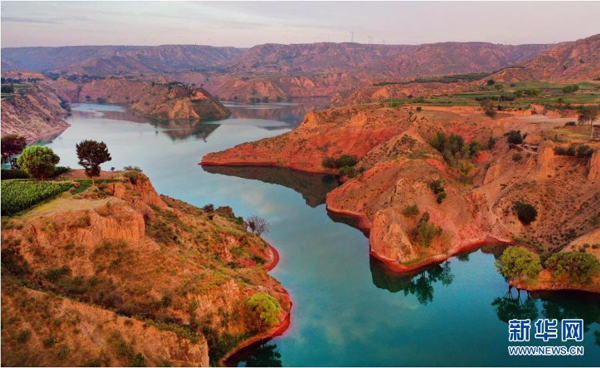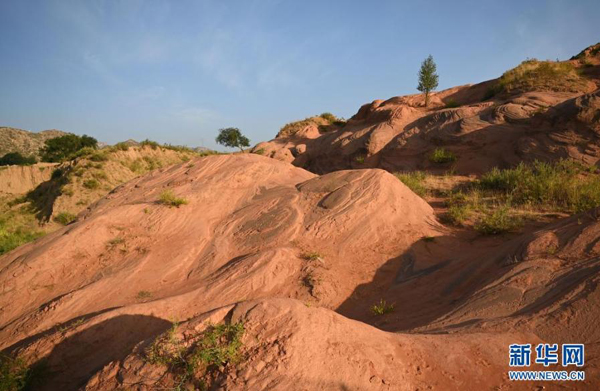8月6日,朝霞映照下的靖邊縣龍洲鎮波浪谷丹霞景區。