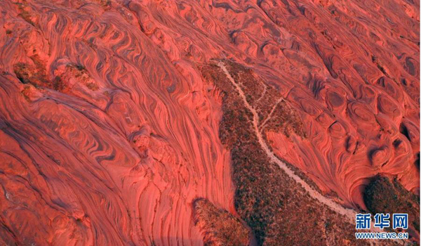 8月6日,朝霞映照下的靖邊縣龍洲鎮波浪谷丹霞景區(無人機照片)。