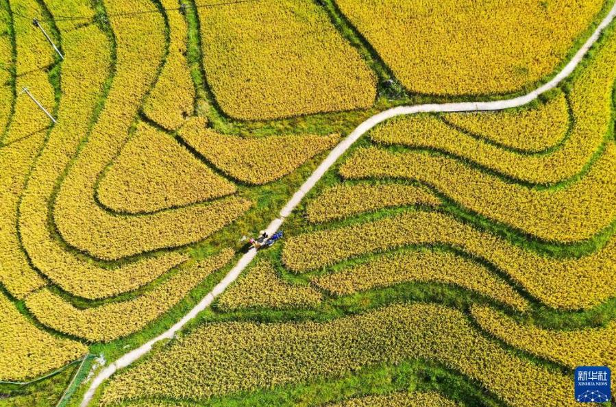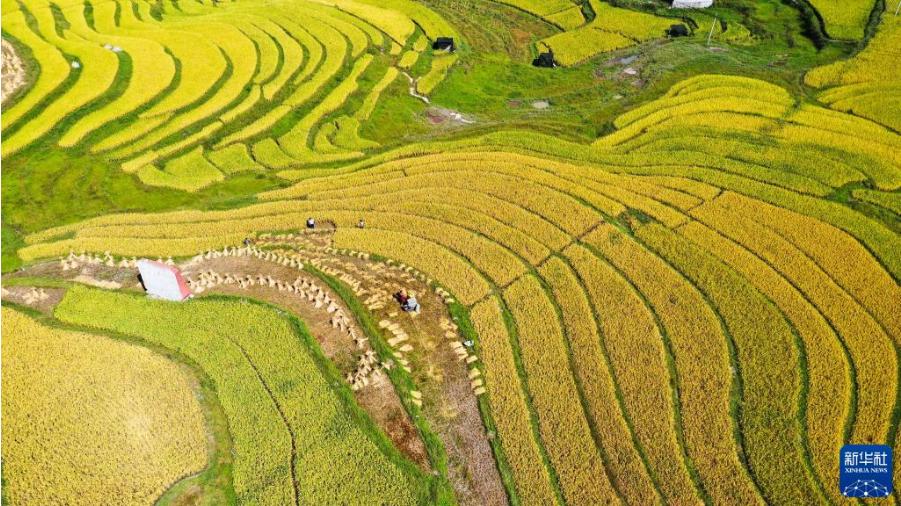 連日來,貴州省黔南布依族苗族自治州龍里縣灣灘河鎮天氣晴好。水稻成熟,田野鍍金,農民搶收稻谷,一片豐收景象。