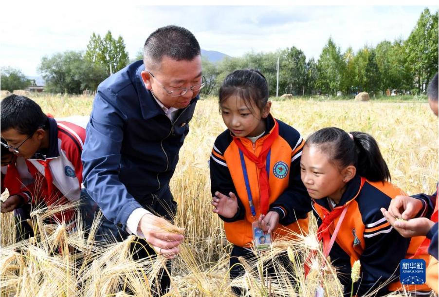 日喀則市上海實驗學校德育副校長潘杰和學生在青稞地里交流(9月17日攝)。