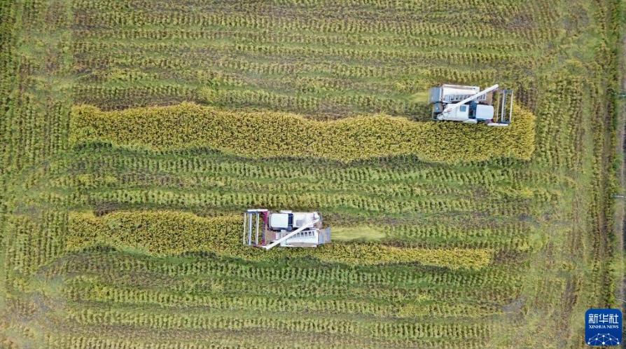 工作人員駕駛收割機在湖南道縣清塘鎮濂溪大洞收割水稻(8月30日攝,無人機照片)。