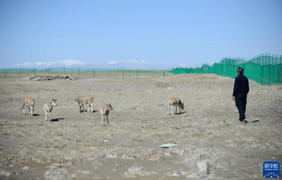 在可可西里國家級自然保護區索南達杰保護站,幾只藏羚羊在野生動物救助中心活動(9月28日攝)。