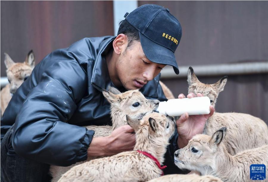 可可西里國家級自然保護區卓乃湖保護站的工作人員才文多杰在給藏羚羊幼仔喂奶(2020年7月7日攝)。