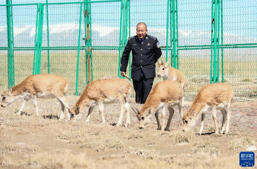 在可可西里國家級自然保護區索南達杰保護站,站長趙新錄與藏羚羊在一起(9月28日攝)。