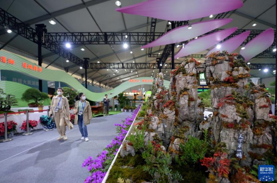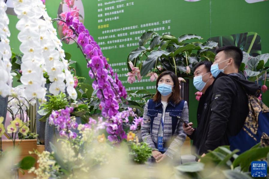 10月15日,參展商(左)向觀眾介紹花卉品種。當日,為期三天的2021年湖南省花木博覽會在長沙市石燕湖景區開幕,設置室內展區、室外展區和花卉苗木基地展區。