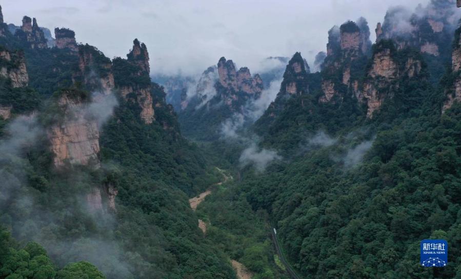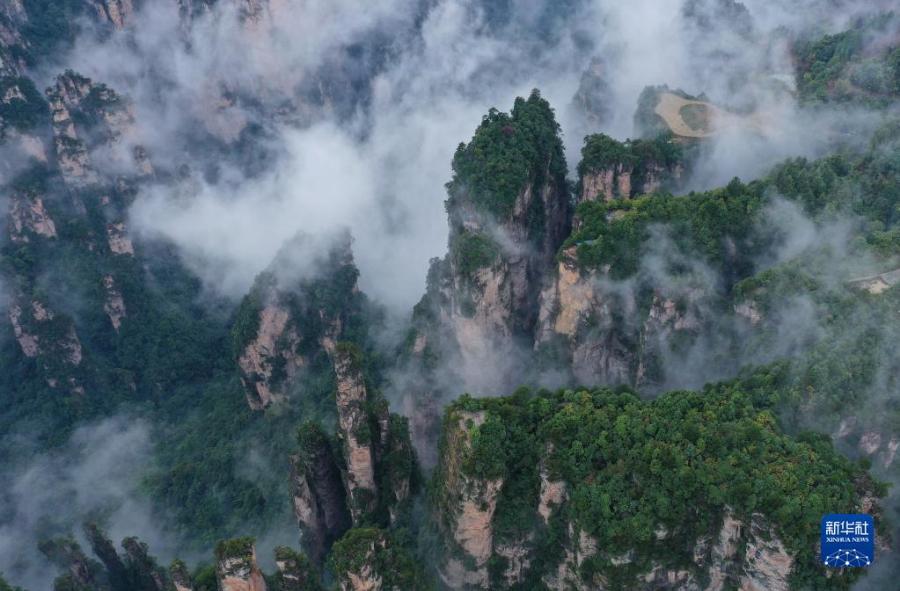 當日,雨后的湖南張家界武陵源,云霧飄蕩在峰林之間,若隱若現,美不勝收(無人機照片)。新華社發(吳勇兵 攝)