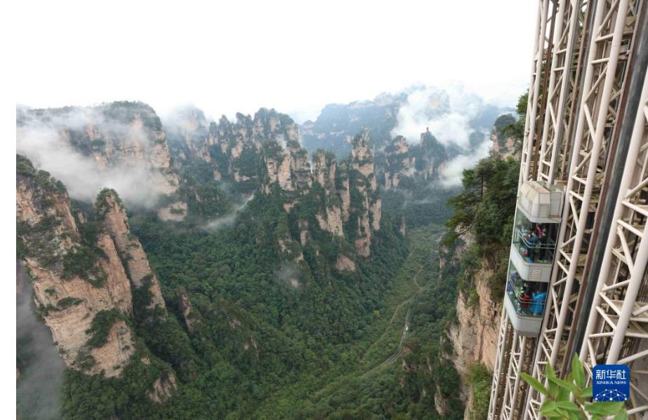 10月19日,游人乘坐百龍天梯欣賞峰林美景。