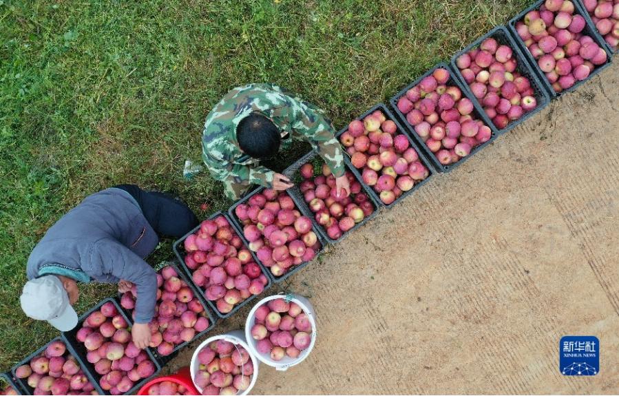 10月21日,在貴州省威寧彝族回族苗族自治縣牛棚鎮龍山種植專業合作社的蘋果園,曹杰的父親曹宣明(右)和村民分揀剛采摘的糖心蘋果(無人機照片)。新華社記者 楊楹 攝