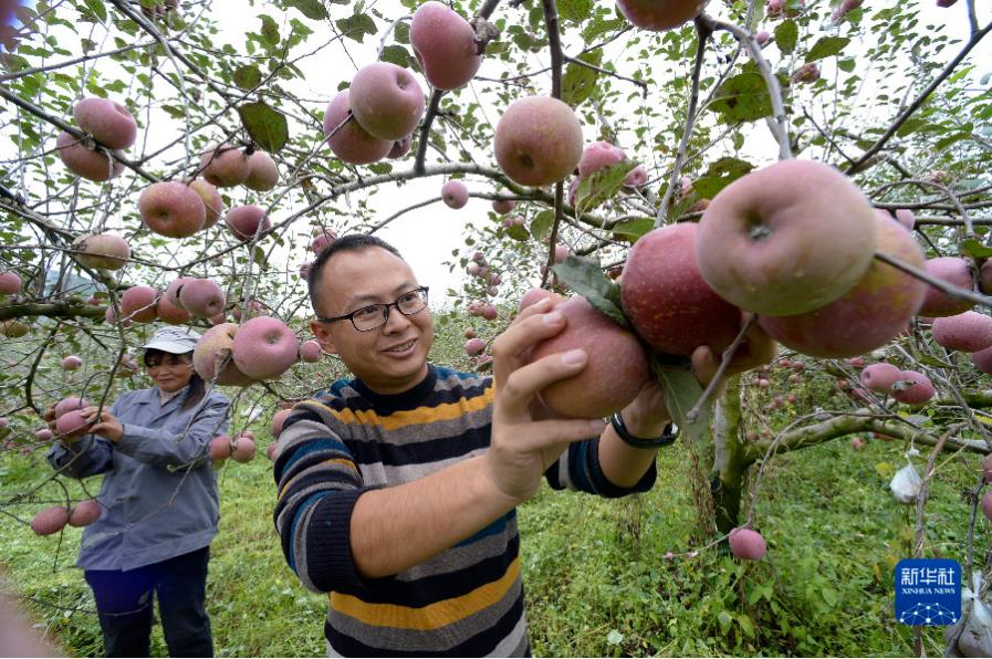 10月21日,在貴州省威寧彝族回族苗族自治縣牛棚鎮龍山種植專業合作社的蘋果園,曹杰(右)和村民一起采摘糖心蘋果。