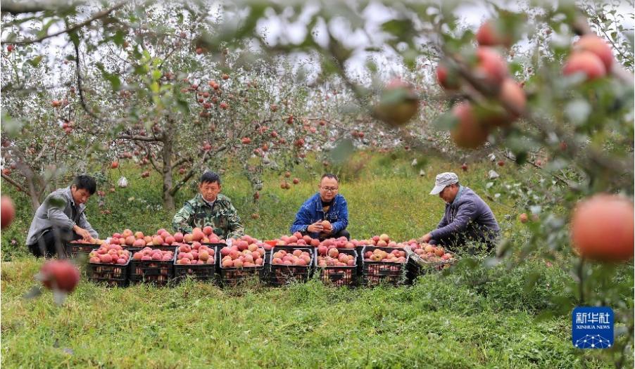 10月21日,在貴州省威寧彝族回族苗族自治縣牛棚鎮龍山種植專業合作社的蘋果園,曹杰(右二)和父親曹宣明(左二)將剛采摘的糖心蘋果裝筐。新華社發(韓賢普 攝)