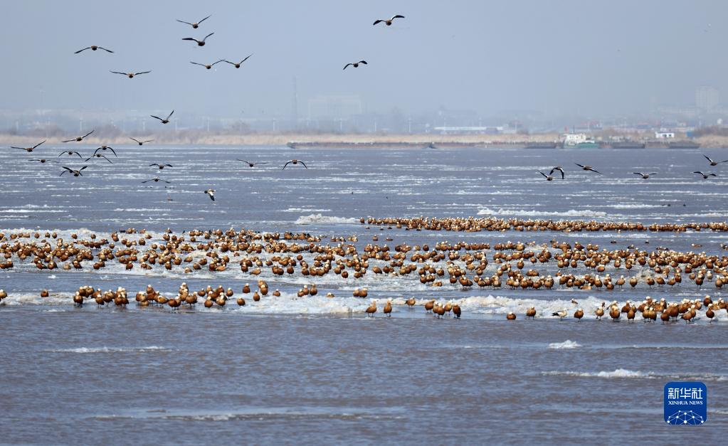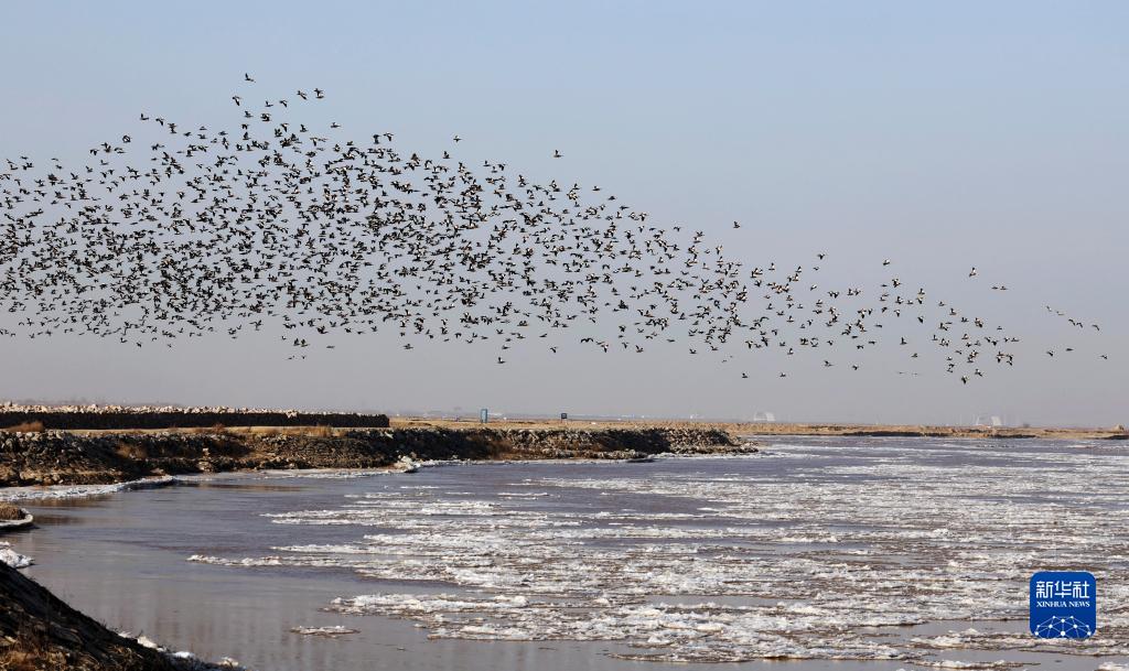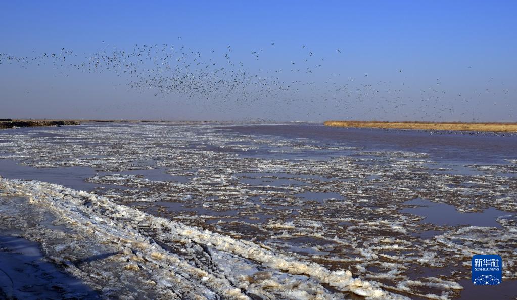 近日,受較強冷空氣影響,黃河“幾”字彎內蒙古段出現流凌。大批南遷的候鳥或在空中翱翔,或在剛剛封凍的冰面上棲息,場面壯觀。
