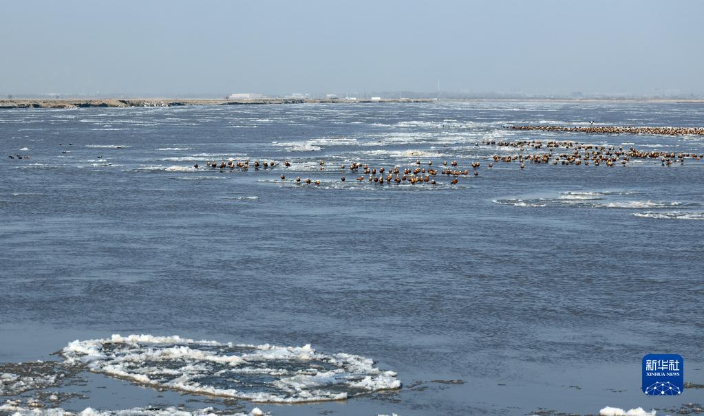 11月27日,在內蒙古鄂爾多斯市達拉特旗,成群的候鳥棲息在剛剛封凍的冰面上。