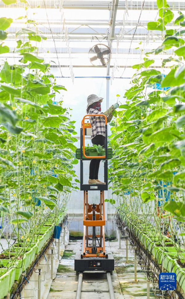 9月22日,在海南省陵水現代農業示范基地,工人為黃瓜苗吊蔓。