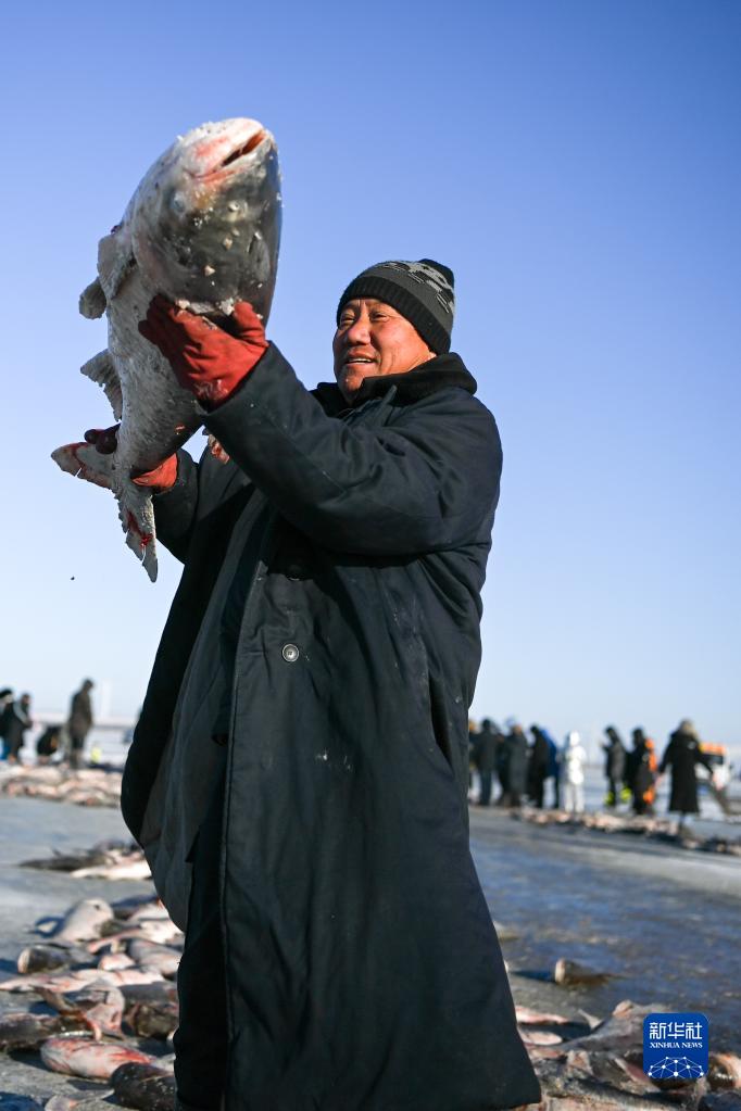 12月26日,漁民從查干湖冰面上的出網點撈出大魚。
