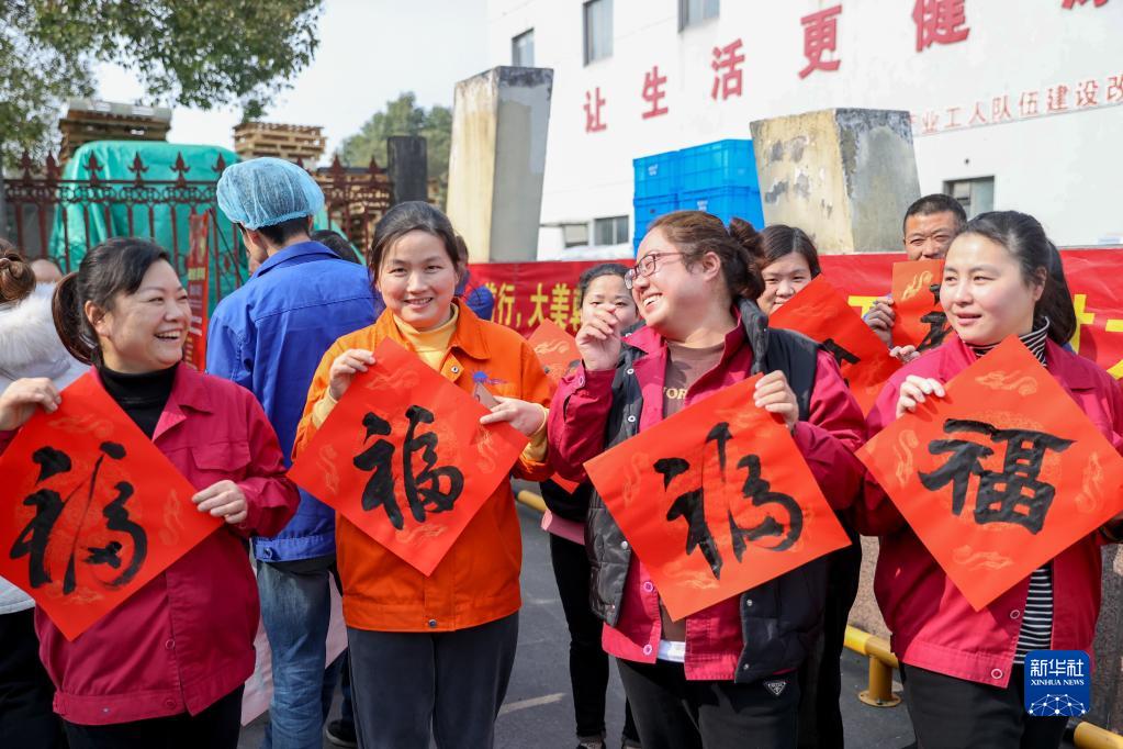 1月19日,在浙江省湖州市德清縣一塑料制品企業,員工展示當地工會送來的福字。