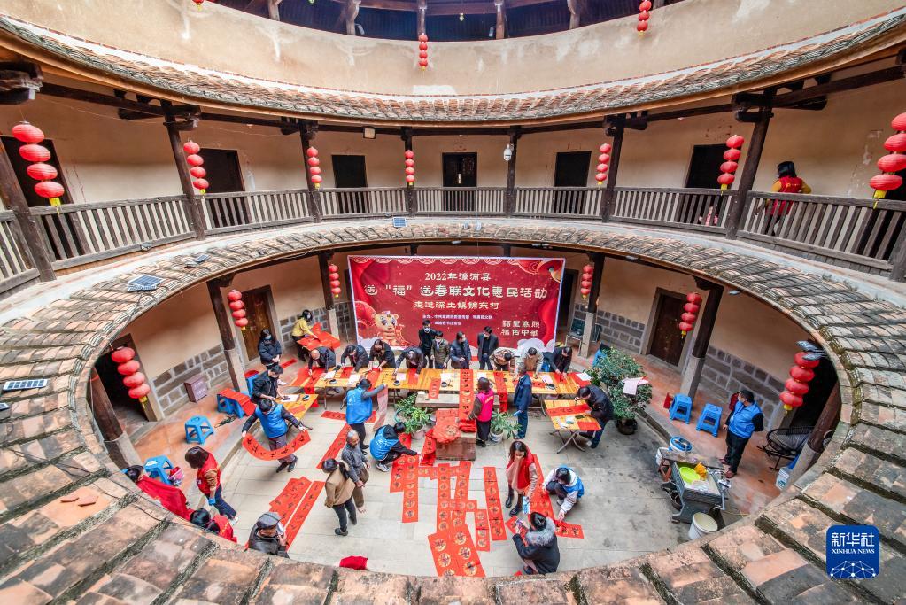 1月18日,在福建省漳浦縣錦東村錦江樓內,書法愛好者為居民寫春聯。