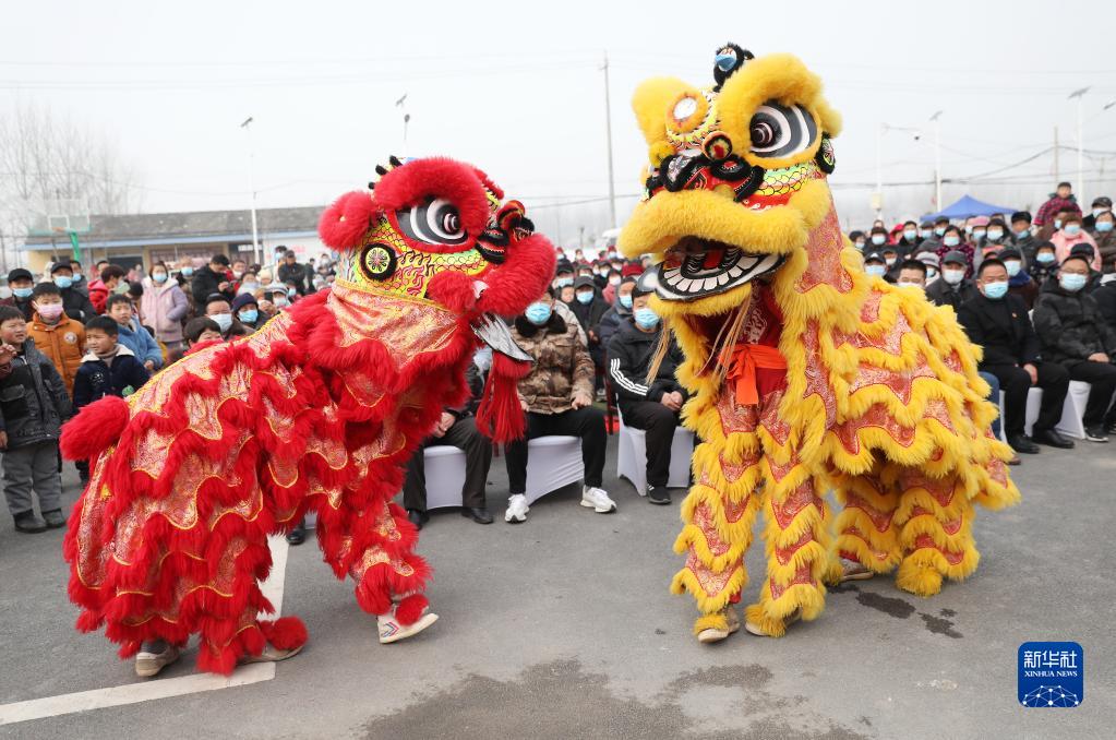 1月25日,在安徽省淮北市烈山區古饒鎮南園村,村民在觀看舞獅表演。
