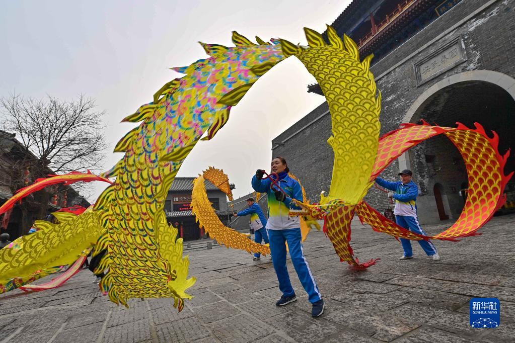 1月25日,在河北省石家莊市鹿泉區龍泉古鎮,民俗藝人在進行舞龍表演。