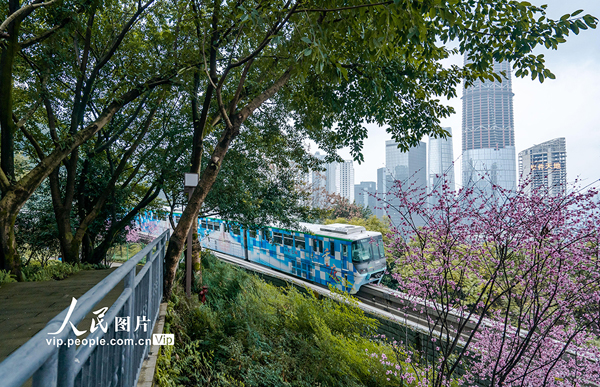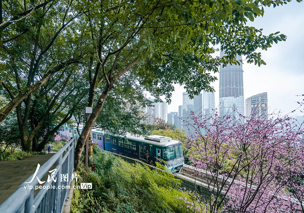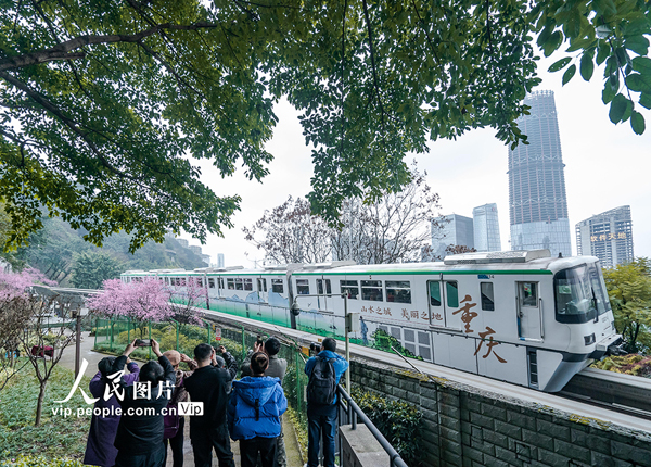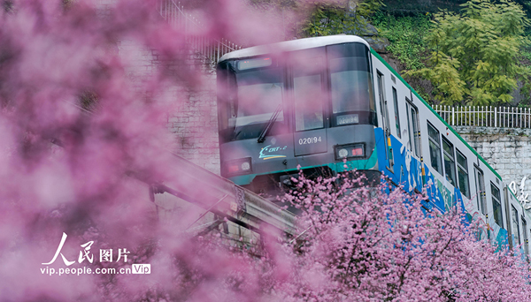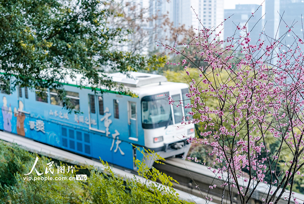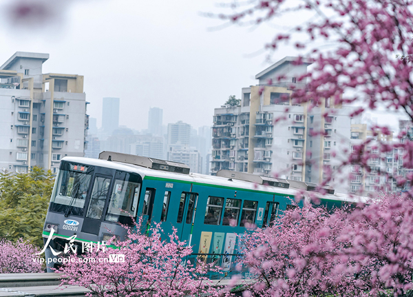 2022年2月20日,重慶市軌道交通二號(hào)線佛圖關(guān)段的美人梅迎春綻放,列車(chē)穿行花海,猶如開(kāi)往春天的列車(chē)。李洪波攝(人民圖片網(wǎng))