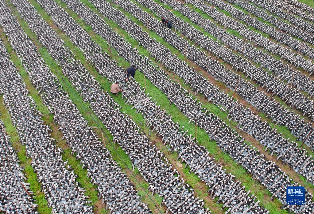 2月23日,在福建省南平市建陽區徐市鎮北岸村的大風車食用菌農產品采摘基地,農戶在黑木耳種植田間作業(無人機照片)。