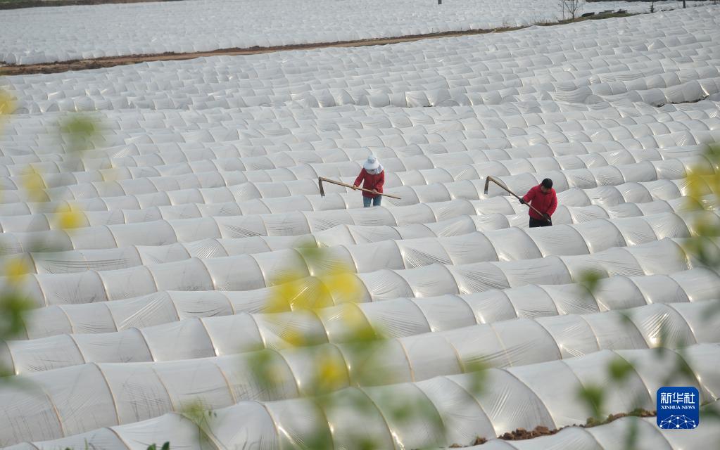 2月24日,在廣西南寧市興寧區五塘鎮西龍村蔬菜種植基地,農民在平整土地。