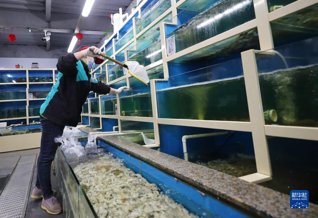 3月15日深夜,在位于上海閔行區(qū)老滬閔路的一家網(wǎng)絡(luò)購(gòu)物平臺(tái)倉(cāng)配站點(diǎn),工作人員在鮮活水產(chǎn)品缸前清理水中雜物。