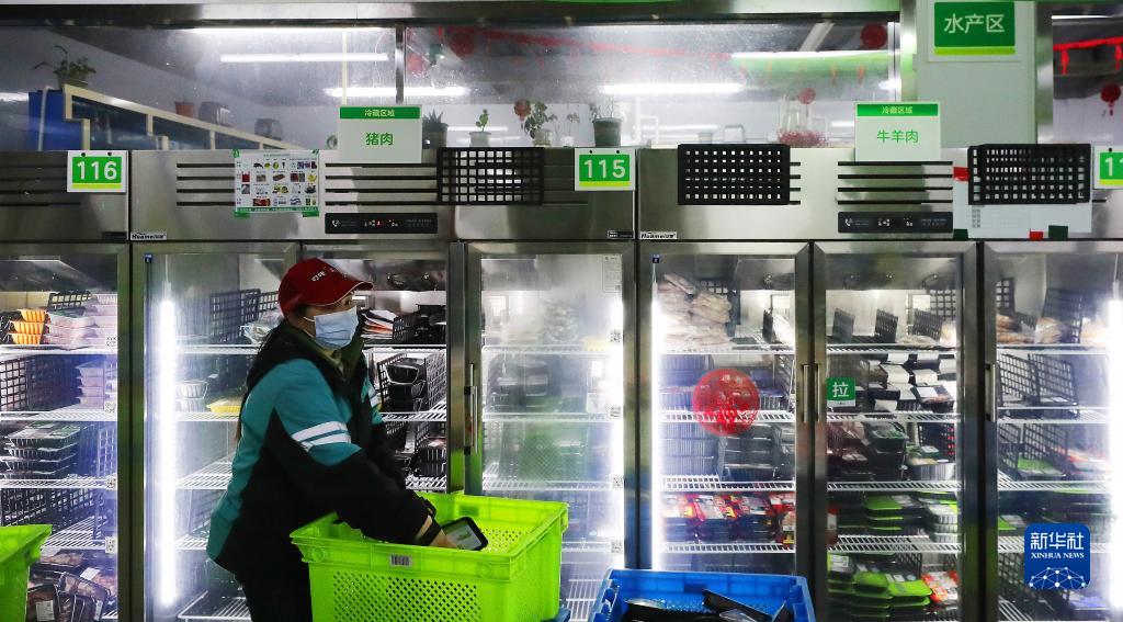 3月15日深夜,在位于上海閔行區(qū)老滬閔路的一家網(wǎng)絡(luò)購(gòu)物平臺(tái)倉(cāng)配站點(diǎn),工作人員將一批生鮮肉制品放入冷藏柜。