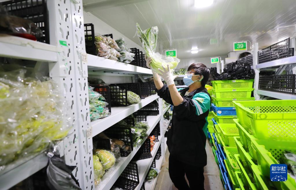3月15日深夜,在位于上海閔行區(qū)老滬閔路的一家網(wǎng)絡(luò)購(gòu)物平臺(tái)倉(cāng)配站點(diǎn),工作人員在冷藏庫(kù)內(nèi)將新到貨的蔬菜分類擺放到貨架上。