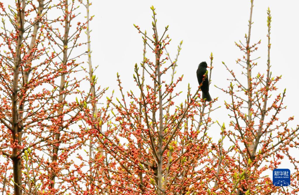 在福州金雞山公園,一只赤紅山椒鳥在樹枝上覓食(3月29日攝)。