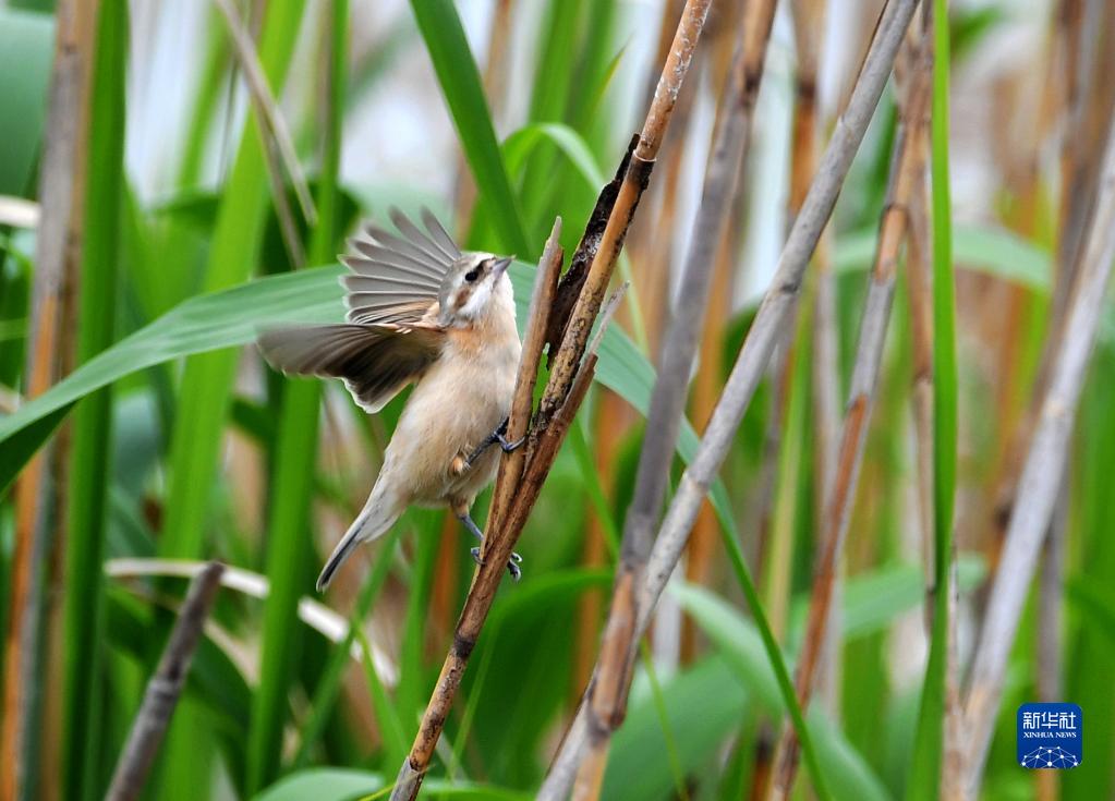 在閩江河口濕地,一只中華攀雀在蘆葦叢中覓食(3月29日攝)。