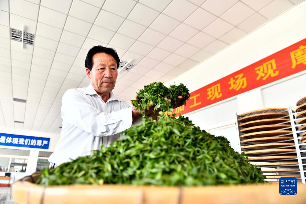 4月22日,在日照市嵐山區(qū)御園春茶葉基地,茶農(nóng)查看春茶質(zhì)量。