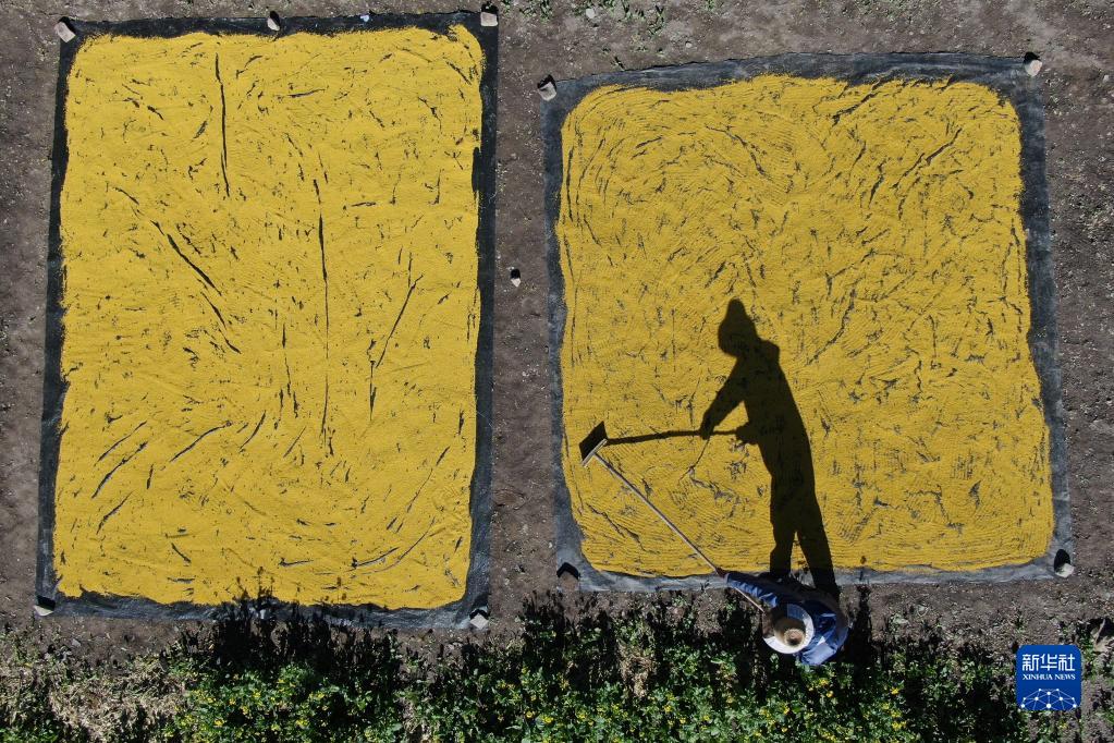 7月3日,在青海省海北藏族自治州門源回族自治縣,馮躍宣在晾曬花粉(無人機照片)。