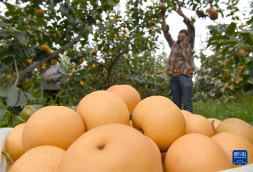 8月31日,寶豐縣欣榮種植專業合作社的社員在采摘梨果。