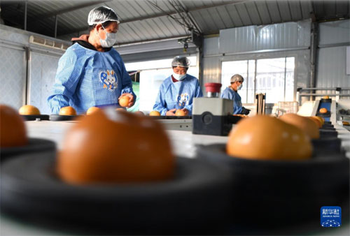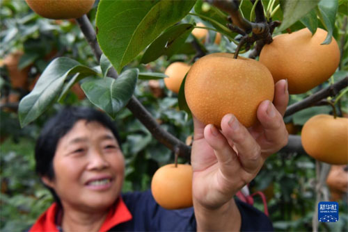 8月31日,寶豐縣欣榮種植專業合作社的社員在分揀梨果。