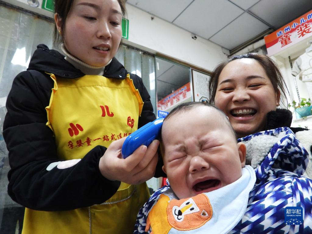 2月21日,理發(fā)師在山東省滕州市一家母嬰生活館為小朋友理發(fā)。