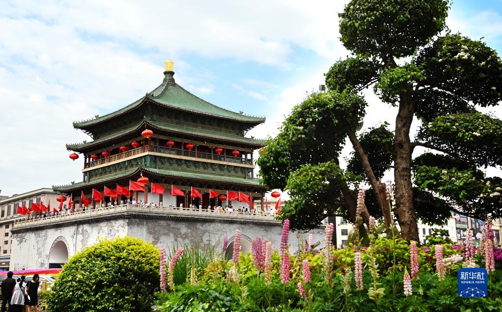 一名游客在西安鐘樓附近參觀(5月2日攝)。