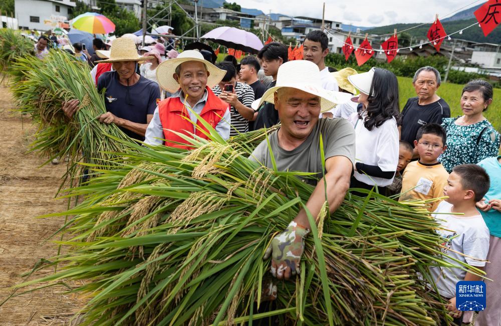 9月2日,在鹽邊縣惠民鎮(zhèn)興隆村的稻田里,村民抱著收割后的水稻分享豐收的喜悅。